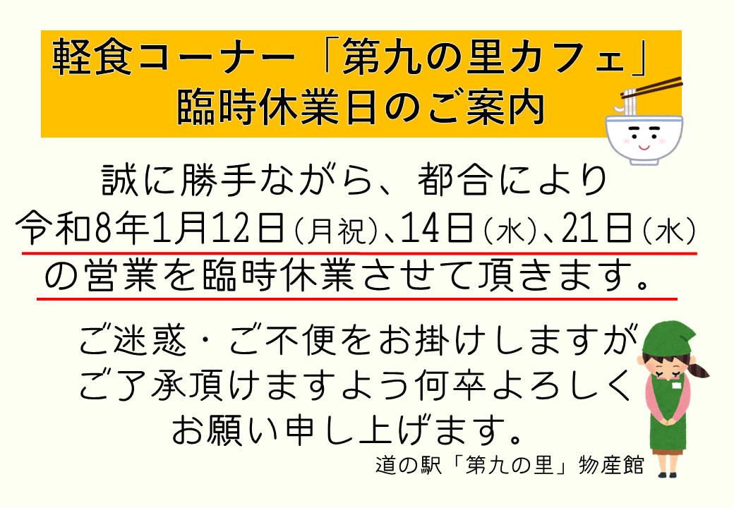 2025.12.26 軽食コーナー「第九の里カフェ」休業日のご案内 軽食コーナーは休業致しますが、道の駅「第九の里」物産館は通常通り営業致しますので お気軽にお立ち寄り頂けますようどうぞよろしくお願い致します。 前の記事へ 一覧へ戻る