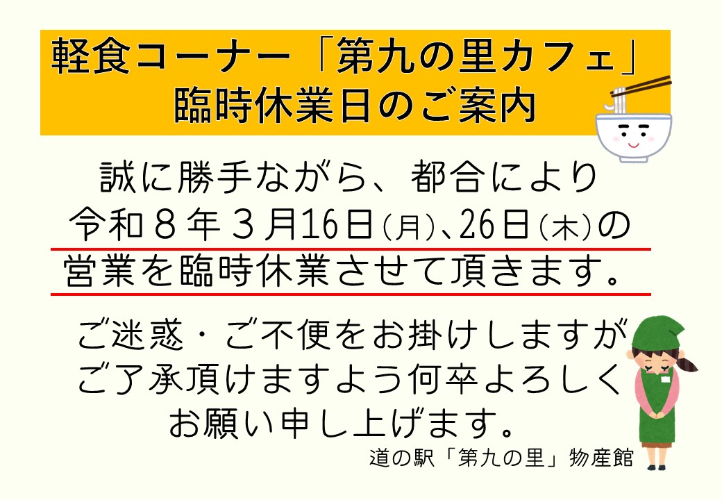 2026.03.02 軽食コーナー「第九の里カフェ」休業日のご案内 軽食コーナーは休業致しますが、道の駅「第九の里」物産館は通常通り営業致しますので お気軽にお立ち寄り頂けますようどうぞよろしくお願い致します。 前の記事へ 一覧へ戻る